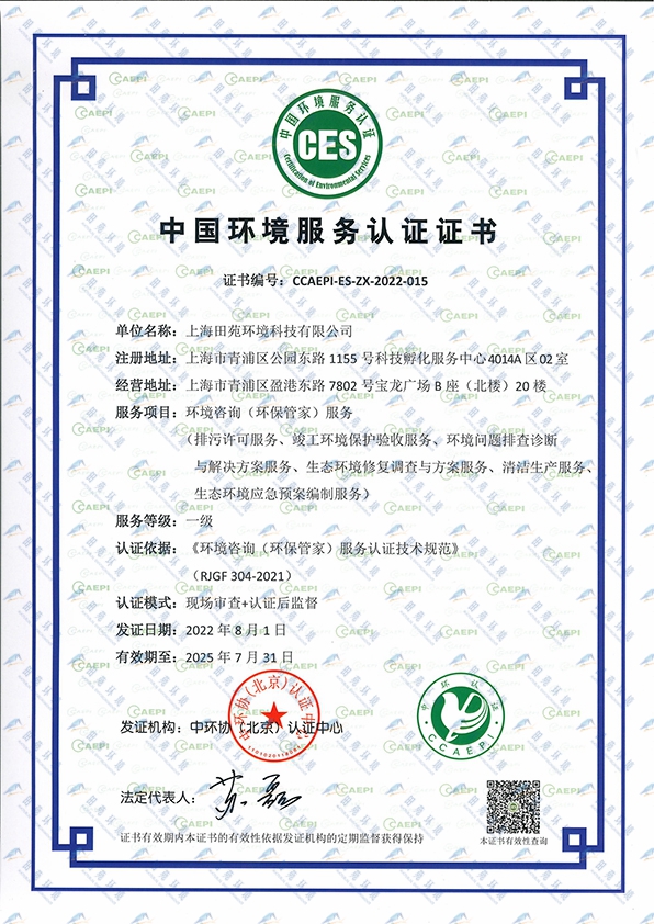 《中國環(huán)境服務(wù)認(rèn)證證書【環(huán)保管家一級】》